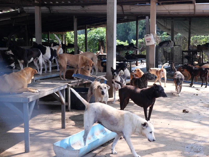 Project: Donate 1 Baht to feed the hungry stray dogs. Please join us in donating dog food to help more than 400 stray dogs on Dog Island, Buddhist Monastery Garden, Nakhon Pathom Province.